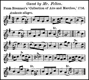The Bishop of Bangor's jig, Lord of Carnarvon's jig, St. David's Day, and Welch Whim are all in different editions of the Dancing Master, and may, from their titles, be presumed to be of Welsh origin, although not reprinted in any Welsh collection. The fine melody Morva Ryddlan (The Marsh of Rhuddlan) is in Aria di Camera (c. 1727) which also includes the characteristic Meillionen, this latter occurs also in several country dance books about 1735-40.