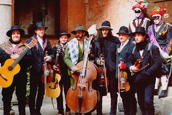 The musicians wear the wooden-soled clogs of the carnevale, and the traditional fustian male outfit of the valley (black, green or brown styled jacket and britches with gaiters) sometimes enriched by a shawl and coloured cuffs, and usually a hat and cloak against the bitter cold.