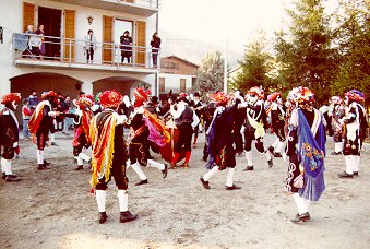 The Fool - The role of the Fool (il paiàso - derived from Pagliaccio), traditional up to the '60s, dressed in rags and with a broom, capering at the Capo's side, has been recently reintroduced by Ponte Caffaro's Fellowship. He is a kind of clown, performed by a skilled dancer with sense of humour. Though not taking direct part in the dance, he helped to arrange it, keeping the dancers in good order and safeguarding their dancing area. He will be seen to be an almost exact parallel to the Morris Fool.