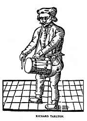 Throughout Europe into the medieval period the pipe and tabor was a frequent source of music for itinerant performers accompanying jugglers, acrobats, popular folk dramas, and a wide variety of seasonal festivities. The Elizabethan clown Richard Tarlton was pictured in a woodcut illustration in his Tarlton's Jests (1600) playing the pipe and tabor, and his contemporary William Kempe danced a Morris dance from London to accompanied by a taborer named Thomas Slye. In rural England the pipe and tabor came to be called 'whittle and dubb' and into this century was the traditional musical entertainment accompanying the visits of masked Christmastide mummers. It can still be heard in parts of rural France, among the Basques, in Catalonia and varieties of it have found their way into the native music of South America.