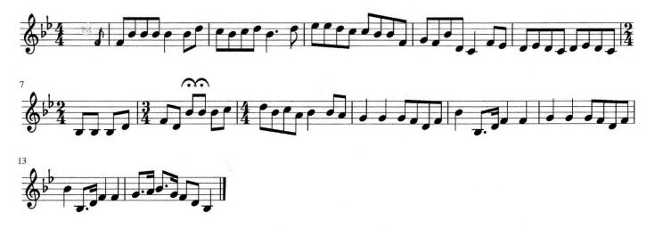 The crucial question is still: what tune? The 'old' Bold Dragoon tune ('My father ... ', etc) as found associated with well enough known sung versions (such as those in Bronson), is four-square and comes nowhere near a fit. But there is a tune by the same name of The Bold Dragoon to be found in The Edinburgh Repository of Music, Vol.I, printed in successive editions from 1815 on; and in O'Neill (1903). These, if at first glance inviting some manipulation to make either fit to text, do turn out to be most relevant. In turn, the tune found in these sources is the same as that adopted by Beethoven - with a twirl of two - for his setting of the Scott poem: The Bold Dragoon.