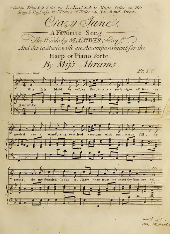 In counterpoint to the use of the Davy tune, there is an entry in a short title catalogue at the Fitzwilliam Museum, Cambridge to the effect that 'Crazy Jane, a favourite ballad ... for three voices ', set by Harriet Abrams, had been published by Lavenu - 'at around 1799' (my italics). The date of this piece, just as in the case of Davy, draws attention. Harriet Abrams was born (c.1758) into a large family of musicians of Jewish descent, several of whom were to be seen singing with her and she made a career - principally - in concert performance rather than 'acting'. She made her debut (aged around 15) in an opera, May-Day, or The Little Gipsy, written especially for her by David Garrick and her music teacher, Thomas Arne, in October 1775 at the Royal Theatre, Drury Lane. She was then and afterwards thought not to have had much of a stage presence nor do there appear to be any particular roles associated with her name but, all the same, her musicianship generally was much admired. One measure of this esteem is that later, at regular benefits - 1792, 1794 and 1795 - Haydn was at the piano.