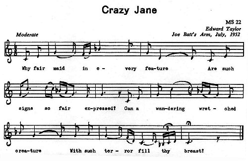 Finally, it is worth recording that whilst Crazy Jane seemed to have sunk out of sight, Henry Burstow's list of songs included Crazy Jane, The Birth of Crazy Jane and The Death of Crazy Jane. Further still, Crazy Jane was collected by Kenneth Peacock in Newfoundland as late as 1952 and the lyrics show a remarkable faithfulness to the original and their vehicle is an interestingly plangent tune that contrasts eloquently with the drawing-room output of Harriet Abrams et al. It is altogether an unusual survival.