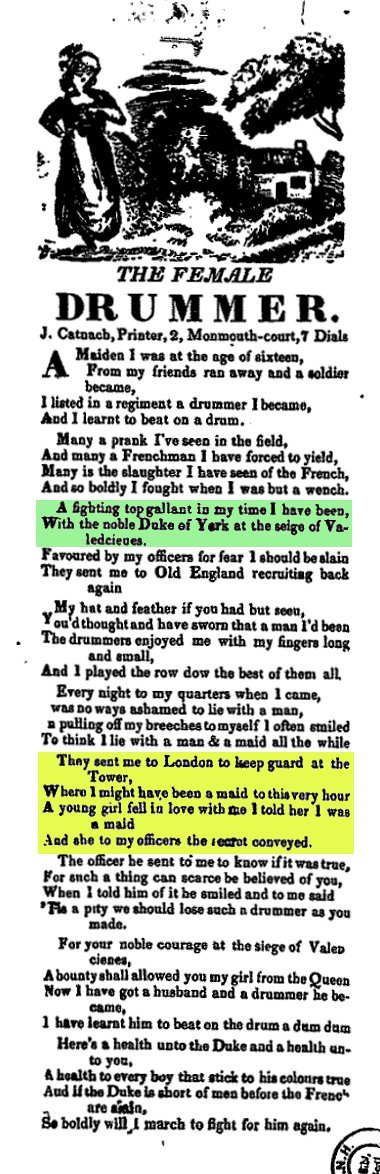 Mary Anne Talbot's account of her life cannot be fully corroborated. Nonetheless, the account of her several adventures is embellished with factual details of the actions of ships and their captains and the host of prominent historical characters she is alleged to have had contact with were around at that time. However, as we have seen, the chronology of events does not always tally. As Stark has shown, for each of the Royal Navy ships she claims to have served on there is no record of a member of the ship's company who could have been Talbot/Taylor but these records were not always reliable. Whether or not Talbot's account of her life was fabricated to gain notoriety or, as Cordingly suggests, is true in parts is a moot point. However, her leg wound does add weight to Cordingly's proposition. Alternatively if Dowie's doubts and Stark's assertion that her account is fabricated are well founded it may be that Talbot took the idea for such a story from the records of other women who served in the army or navy disguised as men. Nonetheless, it is highly likely that Talbot's account of her adventures, whether factual, a mixture of fact and fiction or entirely fabricated, provided the inspiration for the broadside writer to compose the song The Female Drummer. Her claim to have been at the Siege of Valenciennes and the specific mention of this battle in verse three of all the broadsides in the Bodlean library collection is compelling. It is interesting to note that the reference to Valenciennes does not feature in any of the versions of the song that have been collected from oral tradition that I have located.