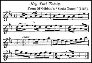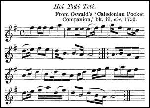In tracing the history of the tune further back, we find the version in Johnson's Scots Musical Museum, vol. ii., 1788, as Hey Tutti Taiti, with a couple of songs to the same air. The first, a foolish drinking-song, begins: