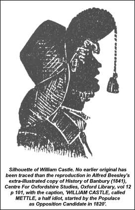 [This is a typical piece of contemporary political satire. There would certainly never have been any serious intention of putting Castle up as a candidate for Parliament. For a similarly pitched response see the entry for May 1841, below. Castle's candidacy between 1818 and 1830 would have had many psychological and social aspects. Among the former was legitimate political expression by the disenfranchised which was sanctioned, even encouraged (see quote immediately following), by the establishment. And among the latter was cultural diversion - or having a damned good time - consisting of parades, dressing up - even if simply wearing favours of ribbons or 'deal shavings' - and plenty of free beer. Although none is mentioned in any of the primary sources for Banbury, political rallies and elections often during this period featured one or more bands of music playing through the streets.]