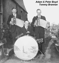 Adam and his brother Peter had learnt to play the button accordion from their father, John Boyd - who also played the fiddle and the pipes - a farm worker from Spylaw, on the Kelso/Yetholm road. When Eddie left Hadden, Adam and Peter joined up with a drummer, Tommy Brannan from Kelso, and formed a band to fill the gap left by Eddie. Peter Boyd, who was older than his brother, had previously played with another button accordion player, Jock Liddle, a gardener from the Hirsel Estate at Coldstream, who had occasionally played with Eddie Quinn. 3