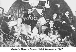 In the late 1940s 'Quinn's Band', as it was then known, comprised: Jock Elliot (piano accordion), who worked in the timber trade; Ernie Lamza (piano accordion) a Polish born mill worker; James Hardie (fiddle), a farmer from St Boswells; Billy Douglas (piano), a joiner from Selkirk; Tommy Heard (drums) a gamekeeper from Bowhill; and, of course, Eddie playing the three-row accordion. Other occasional players would include: Tom Rutherford (2nd fiddle); Andrew Temple (drums), a cabinet maker from Selkirk who sat in for Tommy Heard while Tommy was away doing National Service in the RAF as a bandsman; Walter Bateman (drums), a painter from Selkirk; and Andrew Stillie, yet another drummer from Selkirk. On average the band needed about six or seven musicians. These were the days before amplification and this number of musicians was needed to make themselves heard above the sound of the dancing. One thing that distinguished the band from others was the fact that Ernie Lamza would sometimes leave the bandstand during a dance and walk between the dancers, playing to each couple in turn.