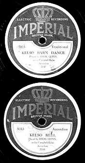 One recording - Kelso Barn Dance / Kelso Reel - was recorded in late December, 1929, and issued on the Imperial label (Imperial S113). Kelso Barn Dance is, in fact, the pipe tune Inverness Gathering, while Kelso Reel is a version of the well-known De'il Amang the Tailors. The other recording - The Gay Gordons / The Laird o' Drumblair - was issued on the Beka label (Beka 3005/06), although it seems that the recordings were originally made by the Parlophone company. If so, then the matrix numbers indicate that these recordings would have been made in early January,