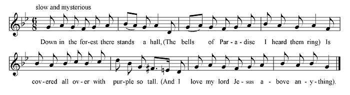 You do not find many songs corresponding to Roman Catholic ideas. But you do find a lot of songs which have a close connection with the gnostic writings of the early Christian fathers, or further back in history still, with the dark old pagan times. And some of them are good songs too in their queer sinister way, like Down in the Forest: