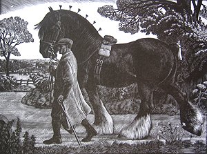 Maybe something should be said about the rather beautiful cover design: it is a 1935 picture by C F Tunnicliffe (1901-1979), entitled Stallion & Groom, which is said to be either a woodcut or an etching, depending on where you look for information! The version used here has been reversed, and its centre obscured by the book's spine - so I thought you might like to see the whole of the original picture - right.