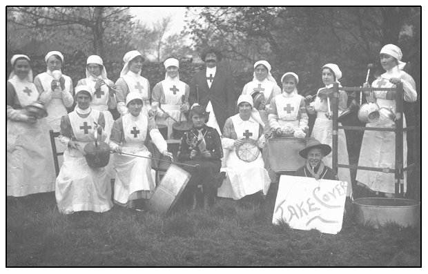 Nurses, a Girl Guide and a Boy Scout in a novelty band of domestic utensils. This is almost certainly part of a carnival to collect funds for their hospital. The notice 'Take Cover' dates it to the Great War, 1914-18, and a pencilled note on the back '9 Cedar Rd Clapham Common' probably locates it in south London. Sale of the postcard would have added to the funds.