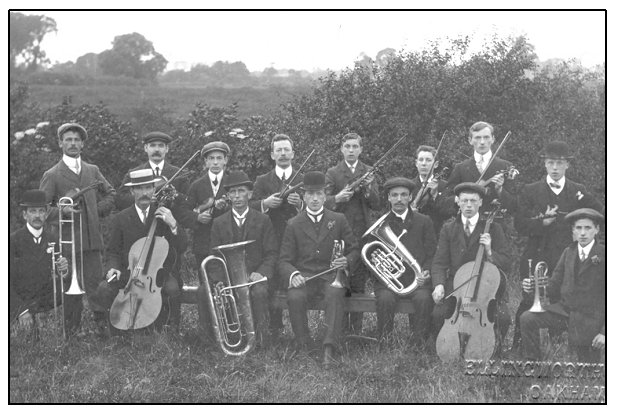A musical ensemble - band or orchestra? - comprised of seven violins, flute, trombone, two cellos, euphonium, two cornets, and baritone horn. One of the cornet players is presumably the leader, as he has a baton, but there is no evidence of printed music. Ellingworth, Oakham, Rutlandshire, pre-Great War, but no further provenance. A private photograph (trimmed) with 'Ellingham, Oakham' embossed on it.
