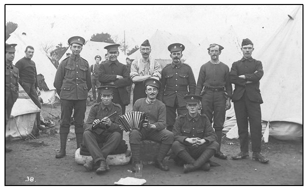 Soldiers in a variety of uniforms at a field camp, probably 1914-18. Band fife and melodeon.Provenance not known. A private photograph. From the Reg Hall Collection.
