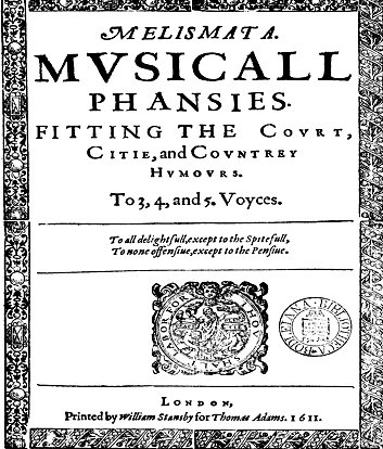 2. Melismata: Musical Phansies Fitting the Court, Citie and Country Humours [attributed to Thomas Ravenscroft], (London: Printed by William Stansby for Thomas Adam, 1611), p.3