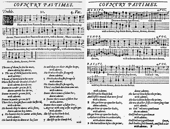 2 Bidgood attributes all three works to Thomas Ravenscroft. Melismata contains twenty three items and is divided into five sections; Court Varieties (nos 1-6), Citie Rounds (nos 7-10), Citie Conceits (nos 11-14), Country Rounds (nos 15-19) and Country Pastimes (nos 20-23). The ballad 'The Three Ravens' is no.20 in the last section.